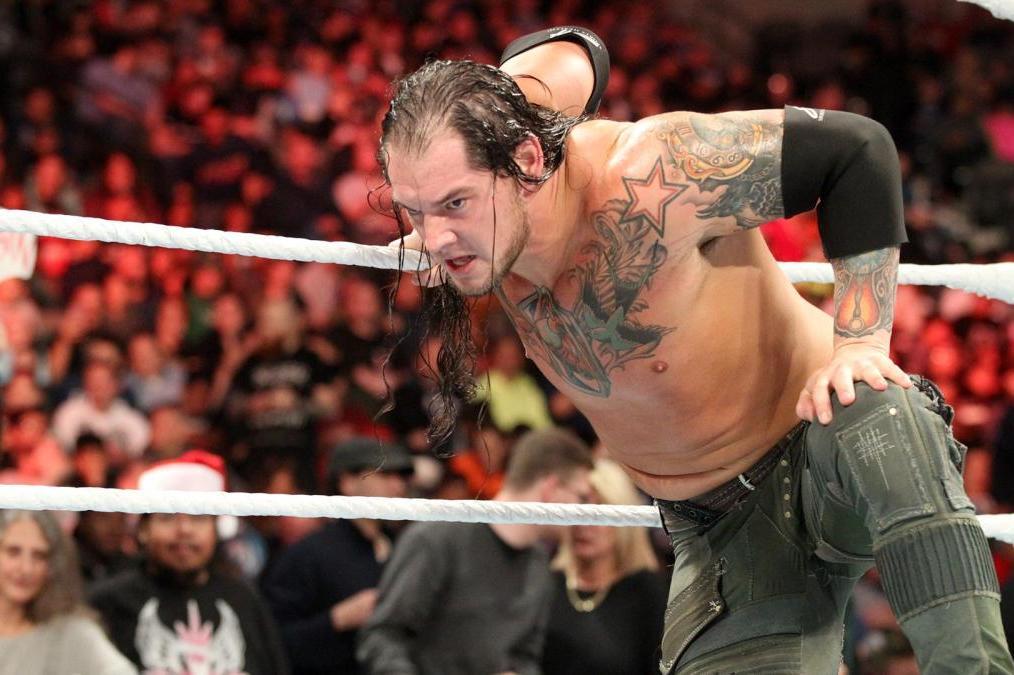 Rollins lanza contra las cuerdas a Cesaro de un empujon.